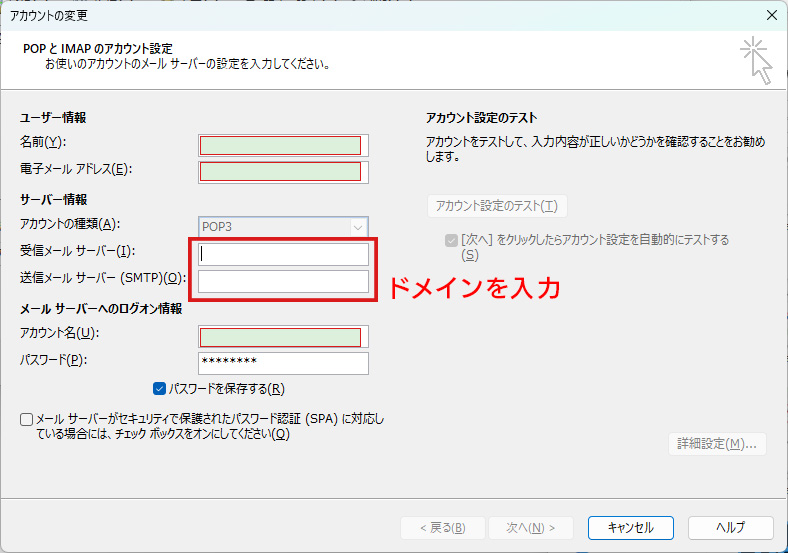 サーバー情報の「受信メールサーバー」、「送信メールサーバー」の欄に、ドメイン名(メールアドレスの@より後ろの部分)を入力し、「次へ」をクリックします。